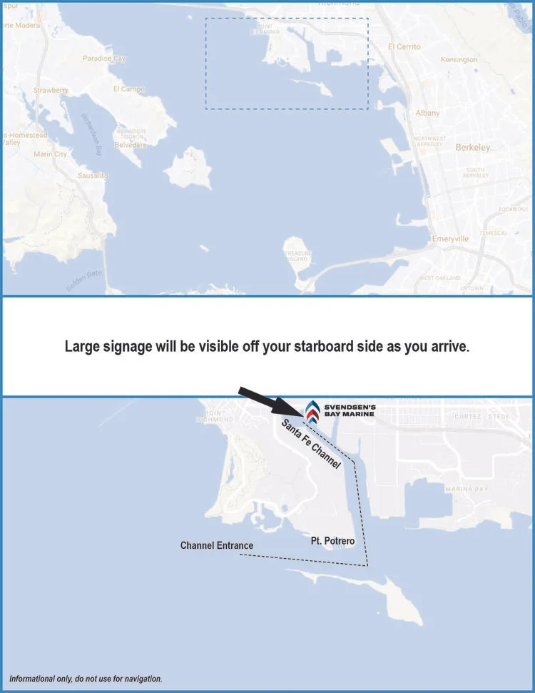 Follow the Potrero Reach East leaving Richmond Yacht Club and a large ship drydock to port. As you proceed, the waterway splits -keep to port, instead of going straight. You are now in the Harbor Channel. Keep to port and it becomes the Santa Fe Channel. Svendsen's Bay Marine is located just past the covered berths & fuel dock at Channel Marina. You may dock in any open space, except for the haulout slip.